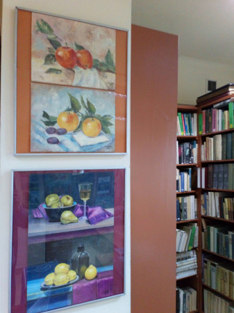 Na bocznej ściance powieszone dwie fotorami z czterema kompozycjami owocowymi