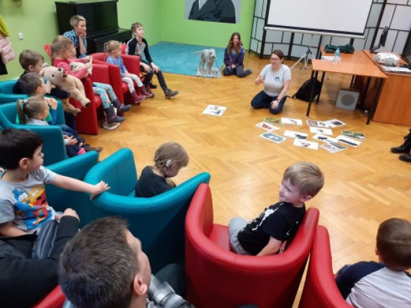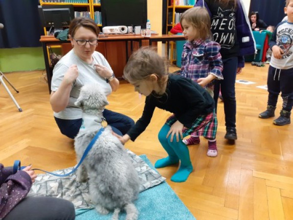 Najpierw obejrzeliśmy historię zakochanych piesków Daisy i Trumpa. Po filmie przyszedł czas na wyjątkowe spotkanie z Agatą, Olgą oraz psem rasy bedlington terrier - Blu. Dziewczyny w ramach inicjatywy My i Psy podejmują liczne działania na rzecz podniesienia poziomu świadomości i edukacji kynologicznej. Podczas sobotniego spotkania dzieci zastanawiały się czy pies w domu to przyjemność czy obowiązek oraz jak zachować się w obecności czworonoga. Chętni mogli również pogłaskać Blu i przekonać się, że jest bardzo mięciutki.