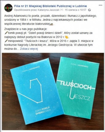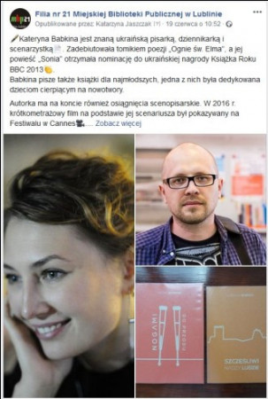 Tydzień 15-19 czerwca poświęcony był w Filii nr 21 współczesnej literaturze naszych sąsiadów, ponieważ wydaje się, że wciąż niewiele o niej wiemy. Zaprezentowałyśmy sylwetki czołowych, nagradzanych pisarzy ukraińskich i białoruskich. Byli to Andrej Adamowicz, Julia Cimafiejewa, Alhierd Bacharewicz, Andrij Lubka, Natalka Śniadanko, Kateryna Babkina oraz Andrij Bondar. Książki tych autorów, wydane przez Warsztaty Kultury, dostępne są w ofercie naszej filii.