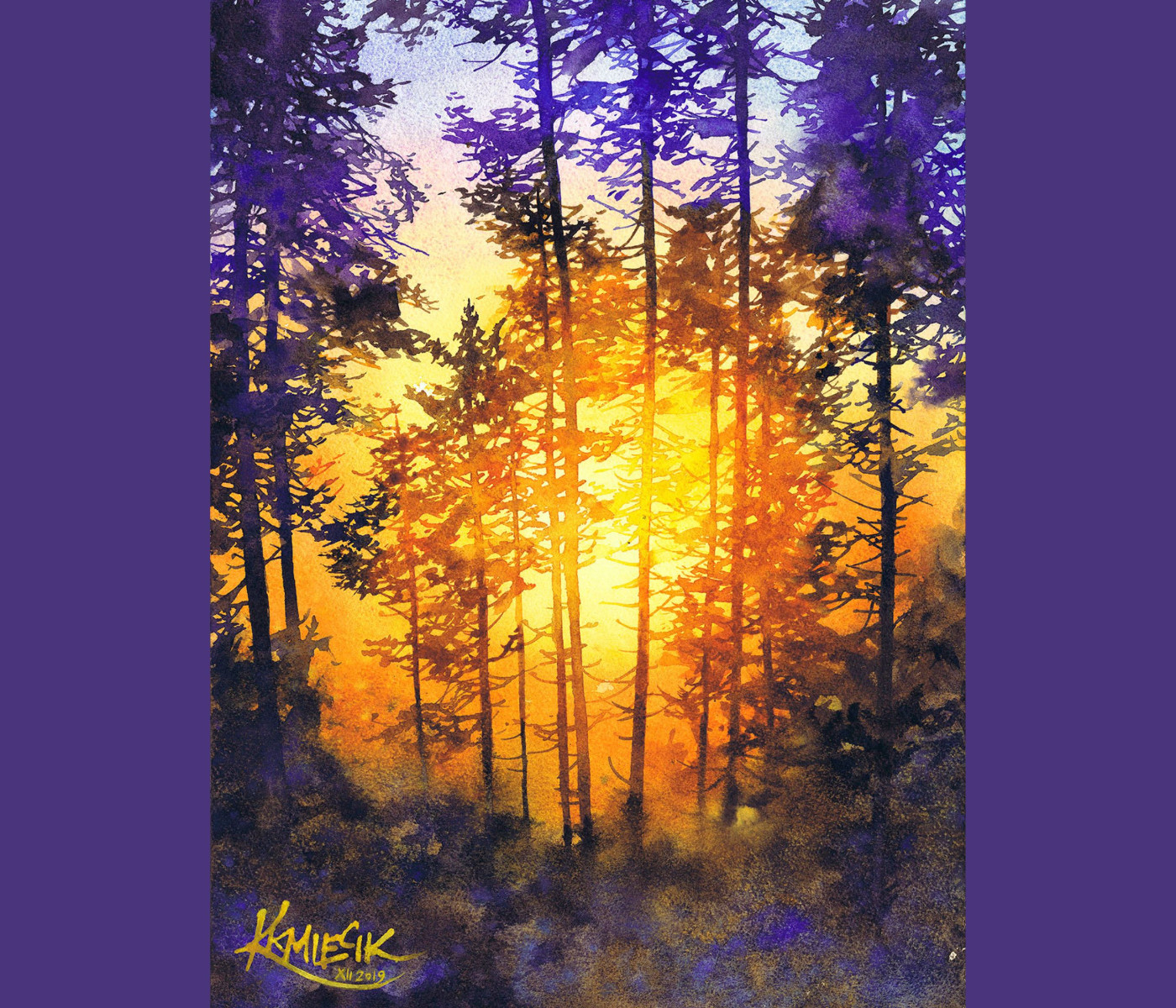 Katarzyna Kmiecik - urodzona, mieszkająca i tworząca w Puławach artystka i ilustratorka, specjalizująca się w technice akwareli, gwaszu oraz rysunku ołówkiem. W swojej twórczości najczęściej sięga po motywy lasów i chmur, których kolory, detale i kształty chłonęła z zachwytem od najmłodszych lat. To właśnie natura otulona światłem stanowi dla niej niewyczerpane źródło inspiracji, ale także przestrzeń osobistej refleksji i zachwytu nad ulotnością chwili.
