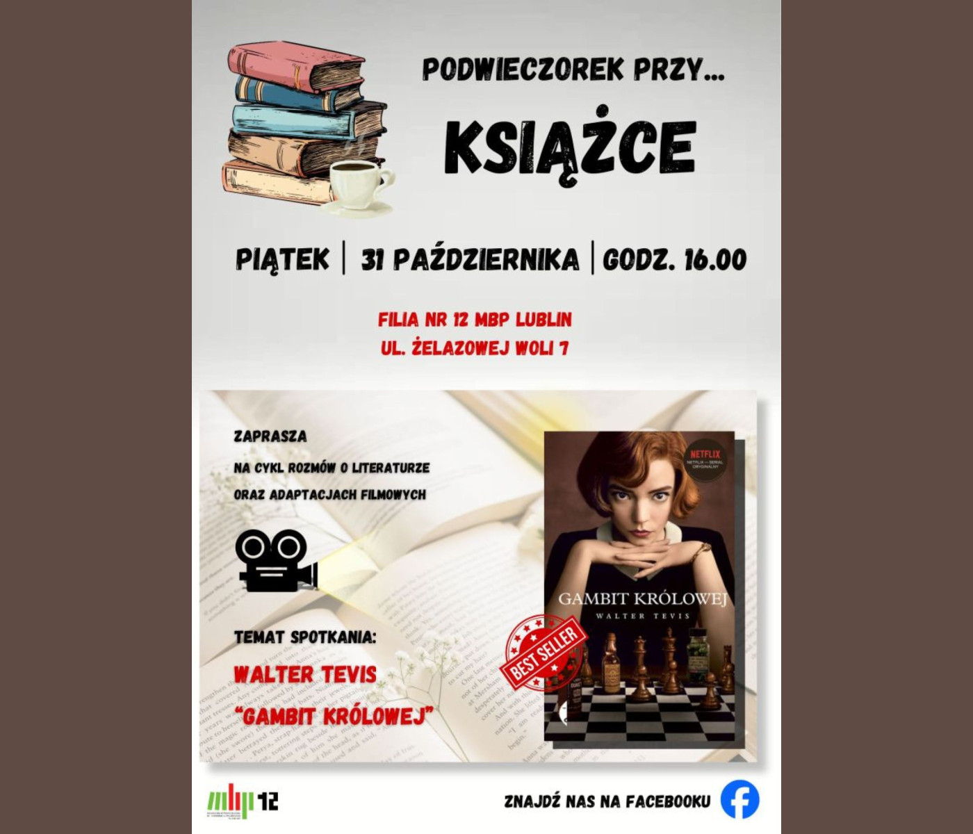 Filia nr 12 MBP Lublin (ul. Żelazowej Woli 7) zaprasza wszystkich miłośników literatury na kolejne spotkanie z cyklu „Podwieczorek przy...KSIĄŻCE", podczas którego - przy kawie i słodkim poczęstunku - uczestnicy rozmawiają o książkach oraz ich adaptacjach filmowych.