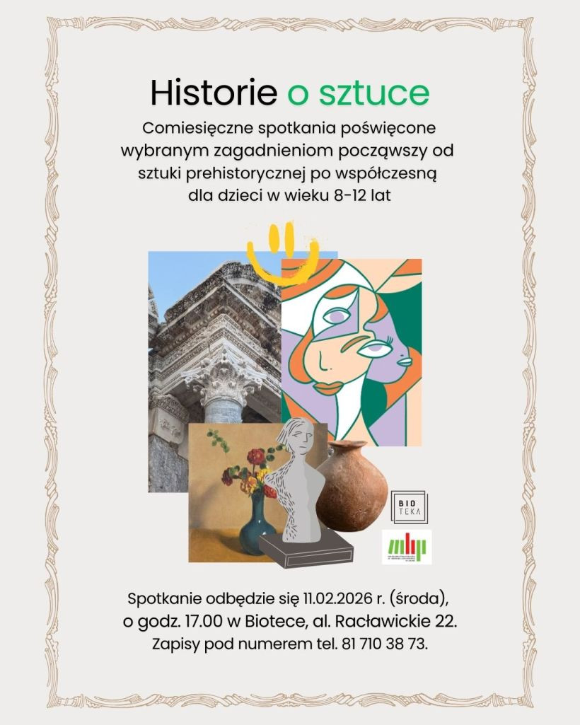Bioteka (Filia nr 6 i 27, Al. Racławickie 22) zaprasza na Historie o sztuce - comiesięczne spotkania poświęcone wybranych zagadnieniom począwszy od sztuki prehistorycznej po współczesną dla dzieci w wieku 8-12 lat.