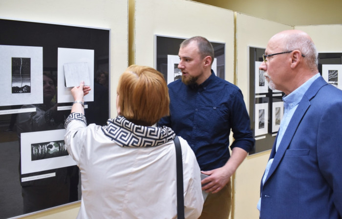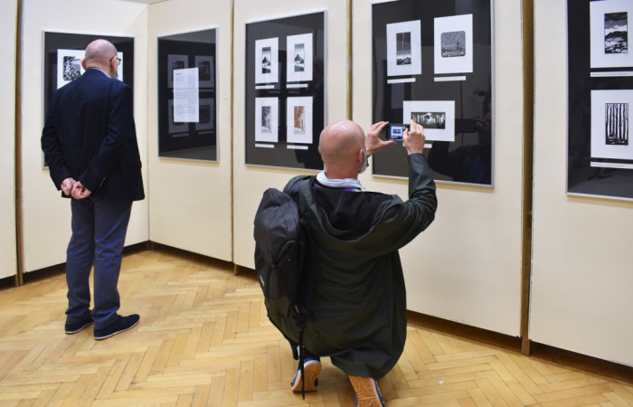 Na pierwszym planie gość wernisażu robi zdjęcie jednej z prac