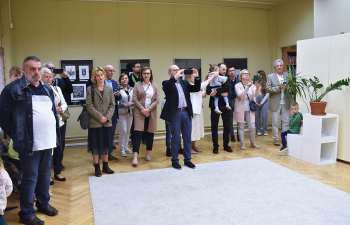 Goście wernisażu oglądają wyeksponowane prace artysty i załączone do nich opisy