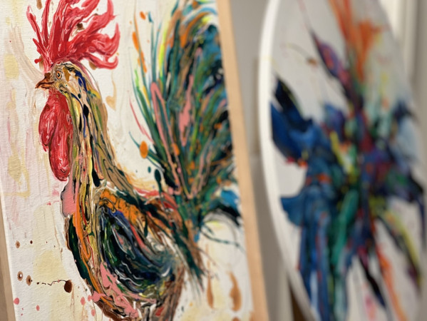 Prezentowane Galerii OKNA obrazy to abstrakcje wykonane w technice pouringu, czyli malowania płynnymi farbami akrylowymi zmieszanych z substancjami, które - stosowane w różnych konfiguracjach i z użyciem różnych środków - dają niepowtarzalne efekty.