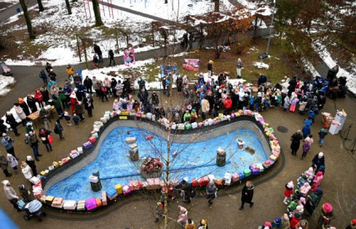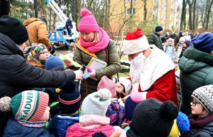 Nastrój radosnego oczekiwania zarówno wśród dzieci, jak i i dorosłych, potęgowały kolorowe dekoracje w kształcie prezentów wokół fontanny na placu oraz wielkie odliczanie. Na sygnał dzieci i Pani Mikołajowej pracownicy administracji LSM na specjalnie przygotowanej zwyżce rozpoczęli wieszanie na liczącym około 30 metrów drzewku ręcznie wykonanych przez mieszkańców ozdób. Rosnący na osiedlu Mickiewicza iglak został przystrojony dekoracjami z materiałów ekologicznych i z recyklingu, a zarazem trwałymi, by wytrzymały kapryśną zimową aurę.