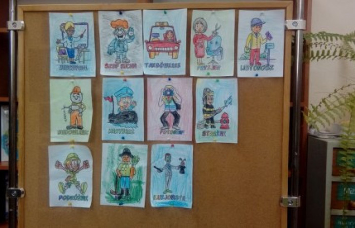Przyszli uczniowie poznali także dawne zawody, takie jak kołodziej,garncarz czy prządka. Nie zabrakło dobrej zabawy w kalambury. Na koniec spotkania wszyscy chętnie zabrali się za kolorowanie postaci m.in. fryzjerki, podróżniczki, kucharza czy taksówkarza.