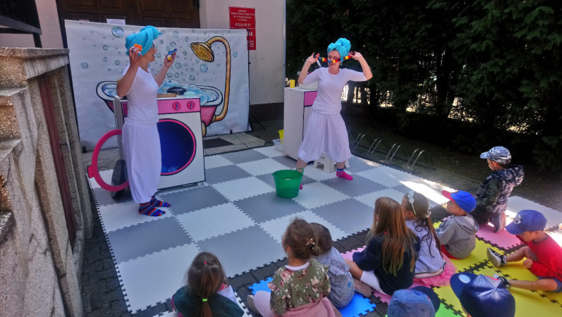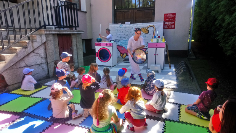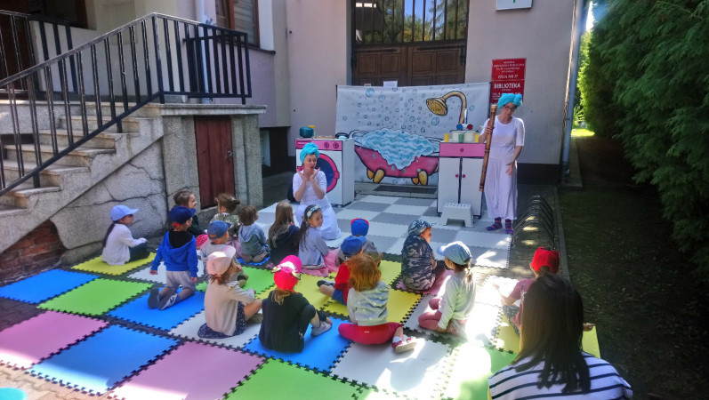 Czy kąpiel, mycie zębów, robienie i wieszanie prania można zamienić w zabawę? Dzięki naszym dzisiejszym gościom mieliśmy okazję przekonać się, że jest to możliwe. Panie Natalia Sacharczuk i Katarzyna Staniewska zaprezentowały naszym najmłodszym czytelnikom, spektakl pt. „Łazienkowe fiku-miku”. Założeniem przedstawienia było nie tylko dobra zabawa, ale przede wszystkim stymulacja wzroku, słuchu, poczucia rytmu i dotyku, a także rozwijanie dziecięcej kreatywności i wyobraźni.