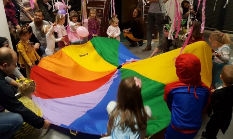 Uczestnicy korzystali z licznych atrakcji: balonowego basenu, zimowej chatki, malowania twarzy. W trakcie imprezy Pippi Pończoszanka oraz Włóczykij porwały maluchy w szał zabawy z chustą Klanzy. W kąciku plastycznym dzieci przygotowywały własne motyle i biedronkowe skrzydła, oraz kolorowały rysunki z postaciami z bajek. Spotkały także bibliotecznego Smoka, który poprowadził pociąg po najciekawszych zakątkach naszej filii. Serdecznie dziękujemy wszystkim za obecność - do zobaczenia za rok!