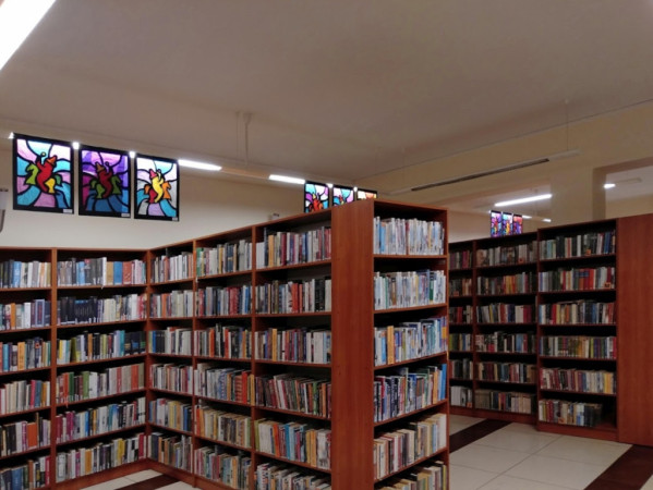 Wnętrze biblioteki - nad półkami książek zawieszone witraże