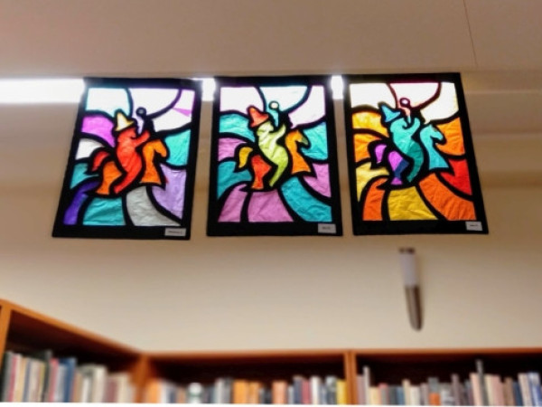 Plakat z kolorowymi witrażami promujący wystawę prac plastycznych