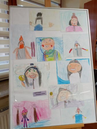 Jedna z wystawowych plansz przedstawiająca polskich olimpijczyków namalowanych przez dzieci