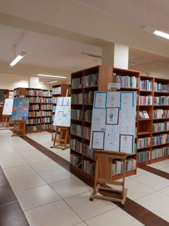 Wystawa "Polscy olimpijczycy" na tle wnętrza biblioteki