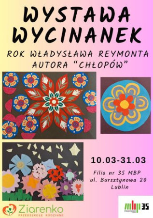 Nieszablonowe obchody Roku Władysława Reymonta w Filii nr 35. Zapraszamy do obejrzenia kolorowych wycinanek wykonanych przez dzieci z Prywatnego Przedszkola "Ziarenko". Prace będą prezentowane w dniach 10.03 - 31.03.2025.