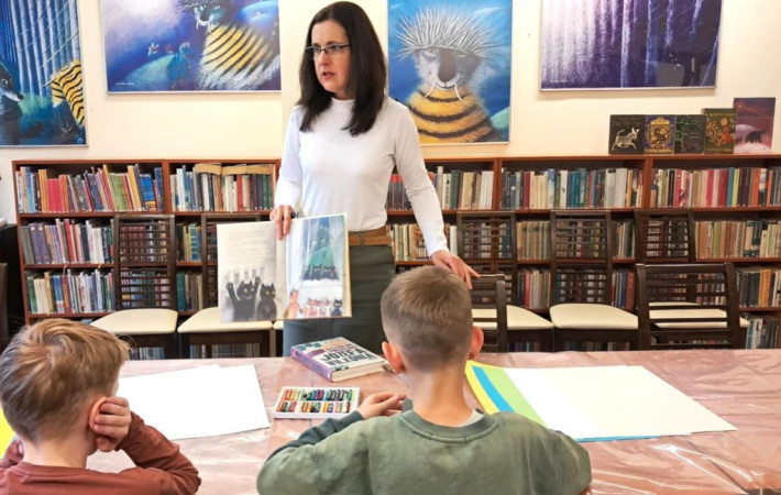 Bibliotekarka pokazuje dzieciom na warsztatach ilustracje Józefa Wilkonia