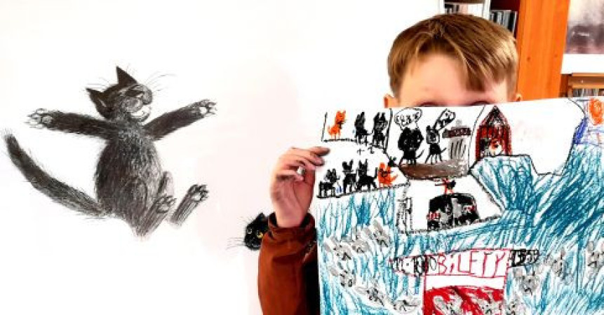 Dziecko prezentuje namalowaną przez siebie ilustrację na tle tej Józefa Wilkonia