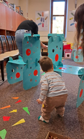 Na dywanie rozsypane jesienne liście, dzieci zbierają do woreczka