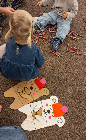 Dzieci siedzą na dywanie, wokół nich rozsypane kredki