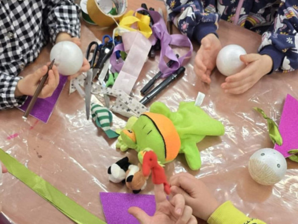 Na stole powstają pacynki, na środku podobizna żaby