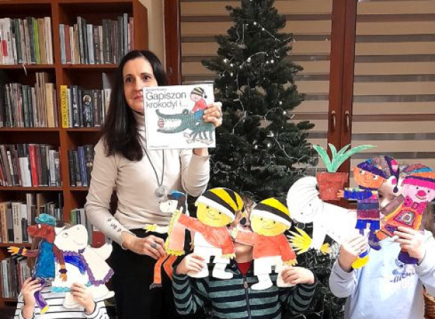 Bibliotekarka Joanna Słupska prezentuje okładkę książki "Gapiszon, krokodyl i..." - wokół niej dzieci