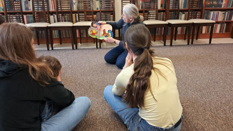 Bibliotekarka pokazuje dzieciom okładkę książki