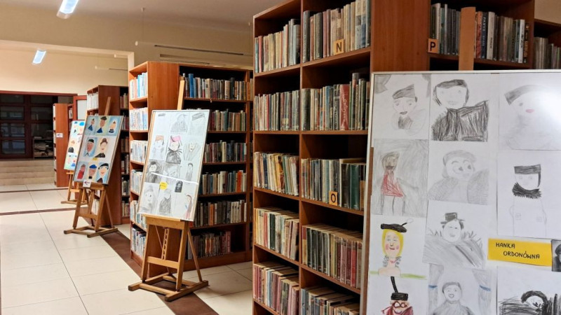 Portrety kobiece namalowane przez dzieci - na pierwszym planie wizerunki Miry Zimińskiej