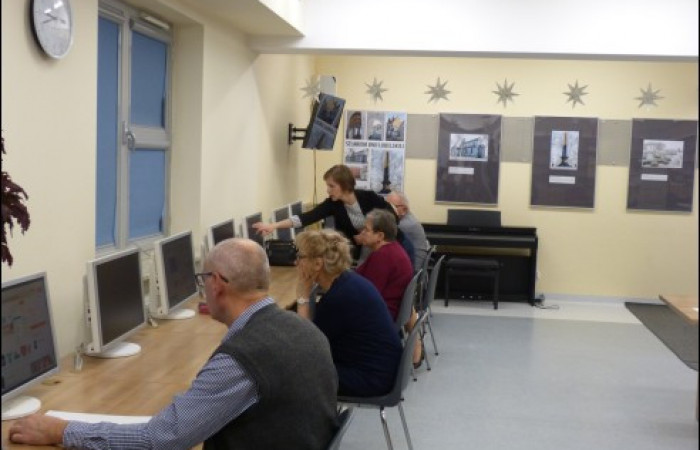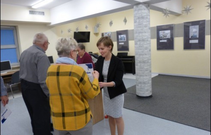 Zakończenie bezpłatnego szkolenia dla seniorów z obsługi internetu w Filii 36 odbyło się w świątecznej scenerii. Siedem osób otrzymało dyplomy ukończenia zajęć na poziomie zaawansowanym, prowadzonych przez p. Elżbietę Nawrocką.