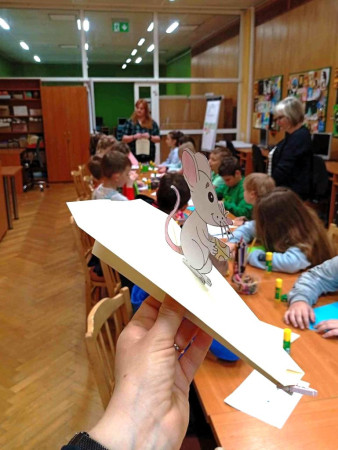 Bibliotekarka prezentuje dzieciom model papierowego samolotu, na którym stoi mysz