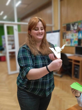 Papierowy samolot z podobizną myszy na górze, w tle - zajęcia plastyczne