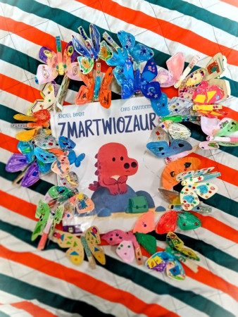 Ksiązka "Zmartwiozaur", wokół niej kolorowe motyle z papieru