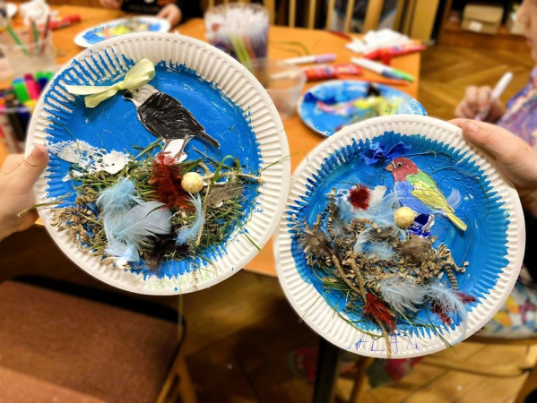 Prace plastyczne na bazie papierowych talerzy - obrazki przedstawiające ptaki w gniazdach