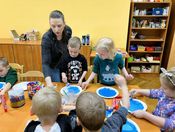 Bibliotekarka nadzoruje zajęcia plastyczne z dziećmi - ozdoby na bazie papierowych talerzy