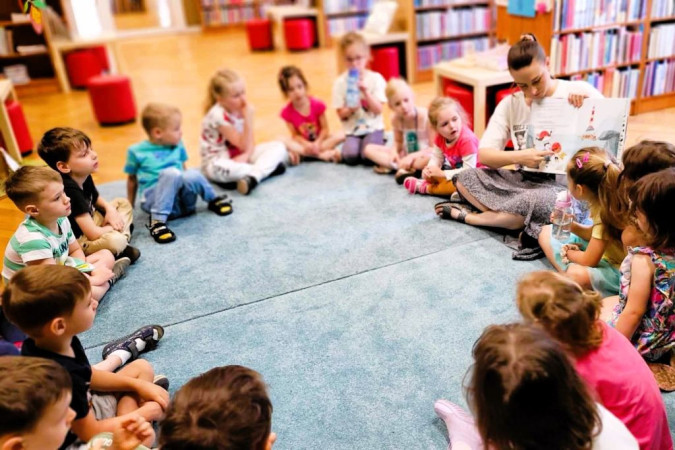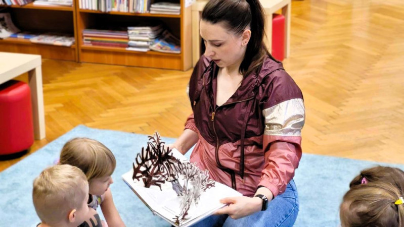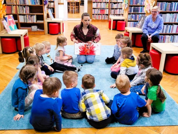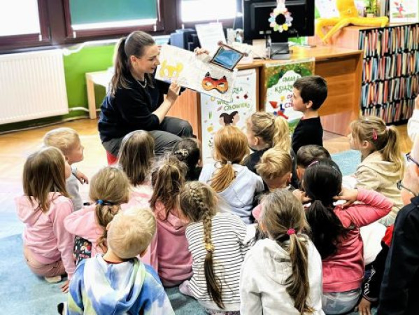 Bibliotekarka pokazuje dzieciom jedną z książek dla najmłodszych