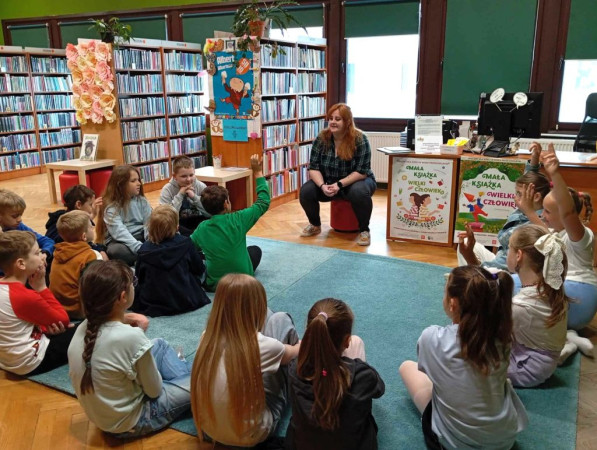 Siedzące na podłodze dzieci rozmawiają z bibliotekarką, kilkoro podnosi ręce w górę
