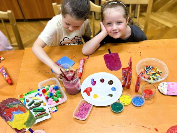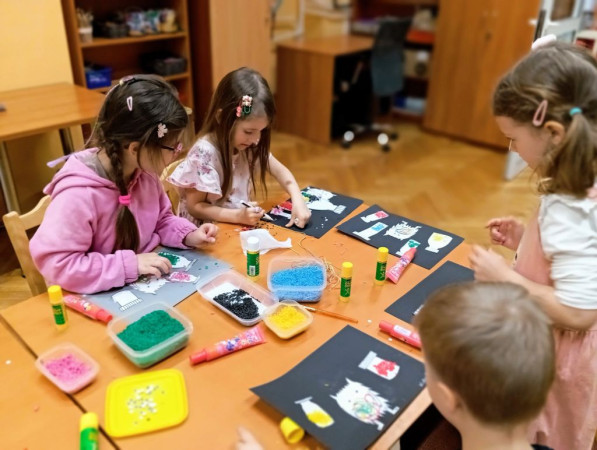 Dzieci siedzą przy stole i tworzą prace plastyczne przedstawiające kolorowego potwora