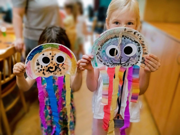 Dziewczynki pokazują wykonane przez siebie kolorowe papierowe meduzy