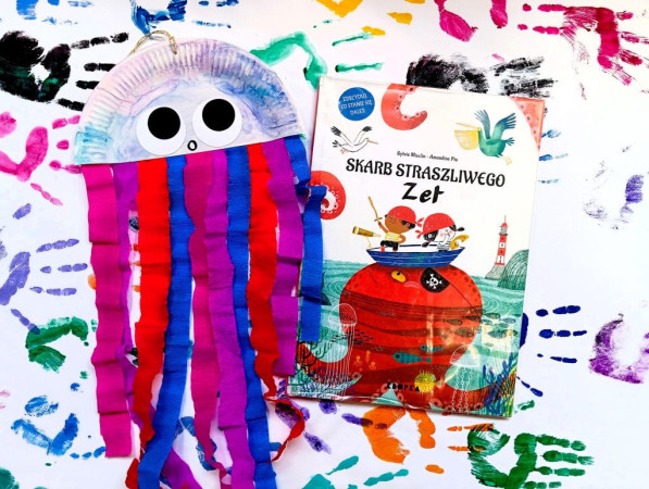 Meduza z papieru i plastikowego talerza, obok - książka "Skarb straszliwego Zet"