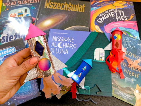Na pierwszym planie: rakieta kosmiczna z rolki toaletowej, w tle książki o kosmosie