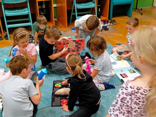 Dzieci przeglądają książki o kosmosie, w rękach trzymają papierowe rakiety kosmiczne