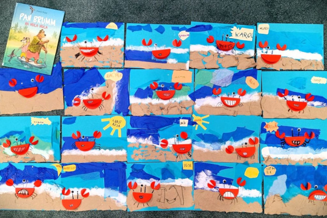 Zbiór prac plastycznych przedstawiających kraby na tle morza, w prawym górnym rogu książka-inspiracja