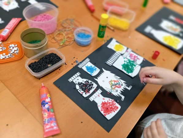 Na czarnym arkuszu papieru powstaje kolorowy potwór, wokół niego fiolki