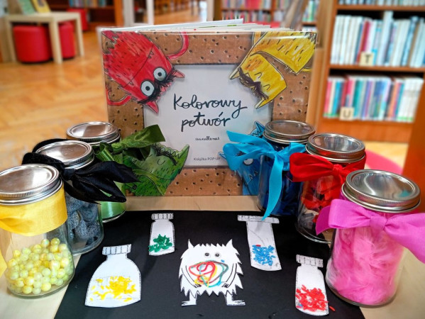 Książka "Kolorowy potwór", przed nią placa plastyczna inspirowana lekturą, po bokach kolorowe akcesoria