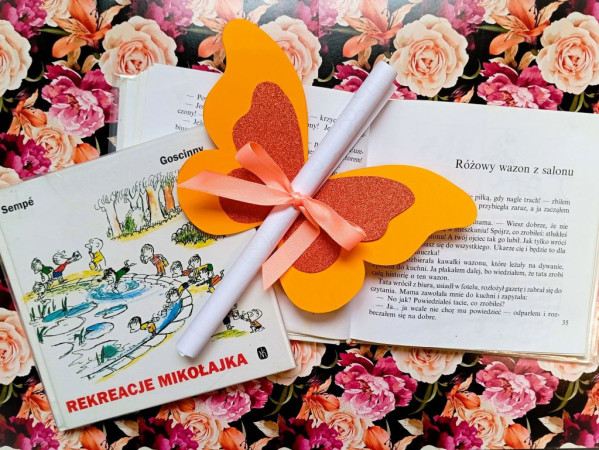 Książki na kwiatowym tle - po lewej "Rekreacje Mikołajka", na środku rulon ozdobiony wstążką i wyciętym motylem z papieru
