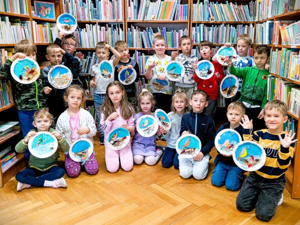 Dzieci prezentują swoje prace plastyczne przedstawiające ptaki w gniazdach, w tle półki biblioteczne