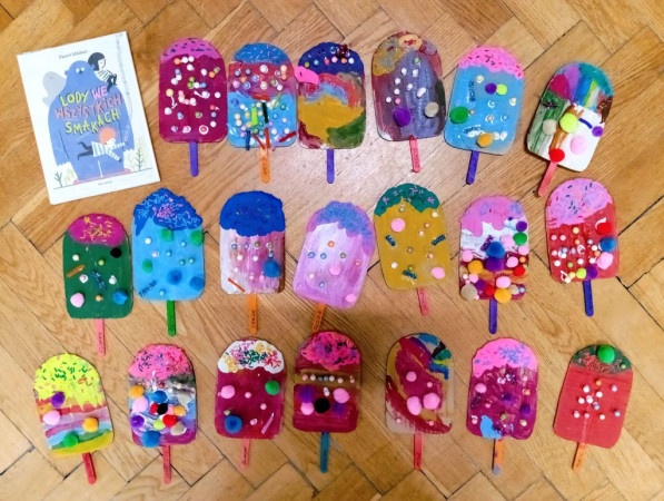Kolorowe papierowe lody na patyku, po lewej - okładka książki "Lody we wszystkich smakach"