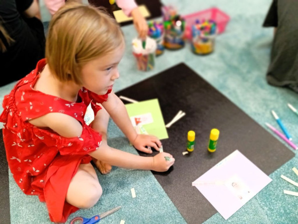 Dziewczynka tworzy kartkę opatrzoną zdjęciem i własnoręcznie wykonanymi podpisami
