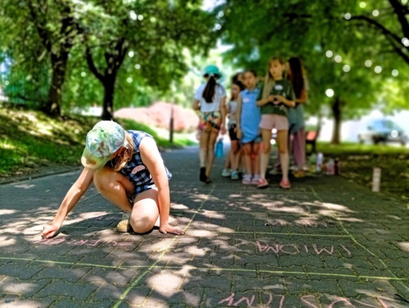Dziecko pochyla się nad grą narysowaną kredą na asfalcie, w tle reszta dzieci
