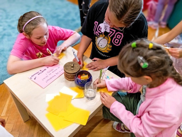 Przy stoliku dziewczynki zapisują informacje na kartkach