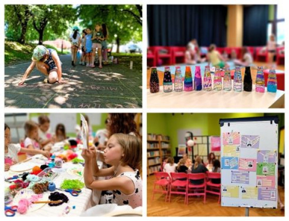 Kolaż zdjęć z zajęć w bibliotece w ramach akcji Lato w Mieście