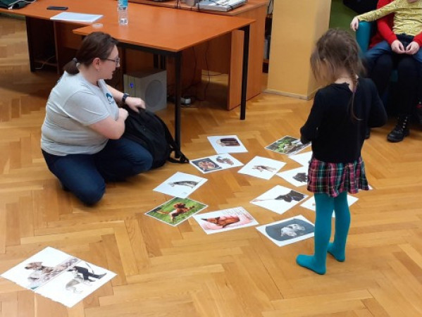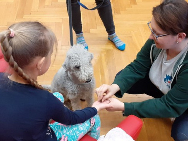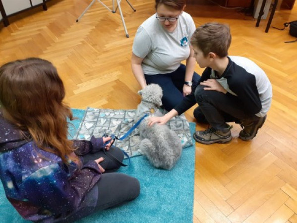 Najpierw obejrzeliśmy historię zakochanych piesków Daisy i Trumpa. Po filmie przyszedł czas na wyjątkowe spotkanie z Agatą, Olgą oraz psem rasy bedlington terrier - Blu. Dziewczyny w ramach inicjatywy My i Psy podejmują liczne działania na rzecz podniesienia poziomu świadomości i edukacji kynologicznej. Podczas sobotniego spotkania dzieci zastanawiały się czy pies w domu to przyjemność czy obowiązek oraz jak zachować się w obecności czworonoga. Chętni mogli również pogłaskać Blu i przekonać się, że jest bardzo mięciutki.
